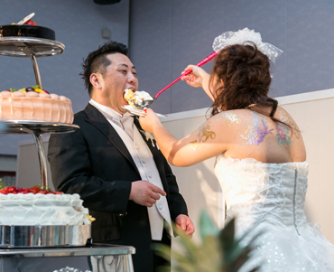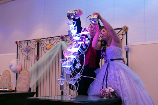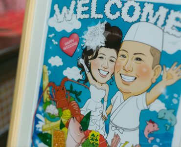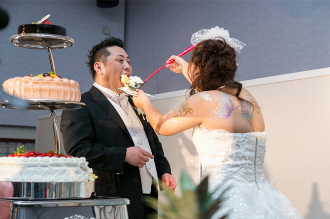 新郎様が料理人ということで、ファーストバイトは特大お玉で!